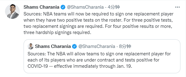 JRS直播12月20日讯 ,由于联盟疫情全面爆发,针对这样的情况,NBA又出台新规从而防止联盟停赛,据名记shams报道,最初的报道为每一名阳性球员对应一个新名额,但他随后更正为如有两名阳性球员,可获得一个名额;如有三名阳性球员,可获得两个名额;如有四名或更多阳性球员,可获得三个名额,即日起生效至 1月20 日,NBA已经和球员工会达成这样的协议。