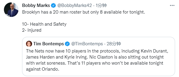 毫无疑问,布鲁克林篮网已经成为联盟最惨球队之一,全队多达10名球员触发防疫协议被隔离,还有2人因伤无法出战——乔-哈里斯和克拉克斯顿,后者手腕受伤并且肿胀;目前篮网拥有20名球员却仅仅只有8人能上场,这是联盟规定的最低出战人数。
