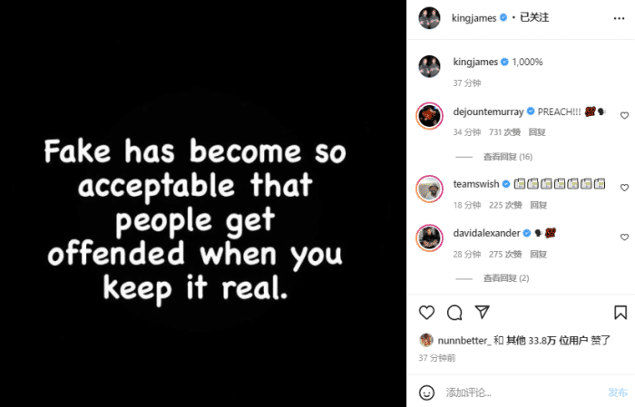 詹姆斯如此动态引热议,短短30多分钟已经有30多万人点赞,其中马刺球员穆雷、詹姆斯好兄弟JR史密斯都在评论区留言支持老詹,纳恩也是为老詹点赞。