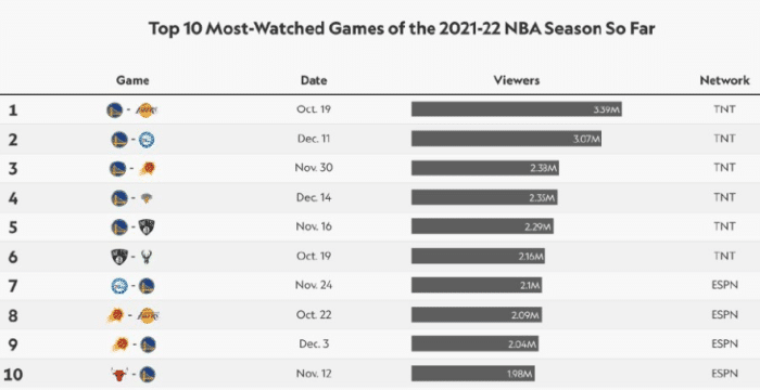 这是媒体统计的本赛季至今,全美直播的单场收视率排名,勇士的人气相当恐怖,在前10名当中,勇士参加的比赛占据了其中的8场,其中还包揽了收视率前4高的比赛。第一名就是勇士和湖人的揭幕战,当时库里大战詹姆斯率领的360组合是最大看点,全美直播的场次吸引了339万球迷们的收看,在本赛季排名第一。