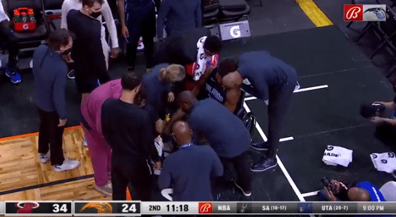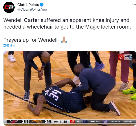 第二节11分18秒,温德尔-卡特与斯特鲁斯相撞,他的膝盖被撞伤,受伤之后他捂着膝盖十分痛苦,魔术队医赶紧冲上球场,小卡特坚持站起来,一瘸一拐无法正常行走,被搀扶回到场边,之后小卡特坐在轮椅上,被推回更衣室,当时小卡特难受地哭了,心情沮丧失控。