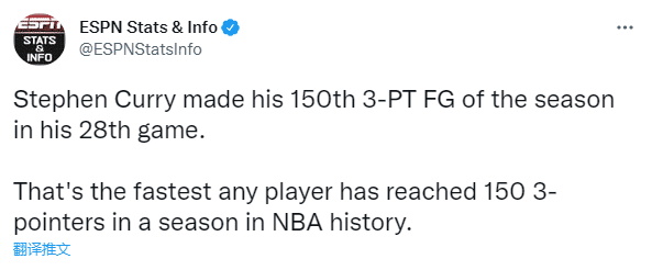 算上本场比赛的5记三分,库里本赛季出战28场比赛,已经命中150记三分,库里又创纪录,成为了NBA历史单赛季最快命中150记三分的球员。