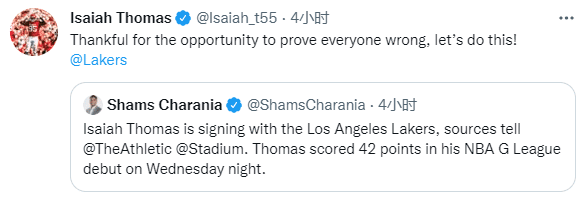 JRS直播12月17日讯 ,由于队内五名球员触发健康与安全协议而被隔离,而且阿里扎和纳恩还在养伤,洛杉矶湖人将用十天短合同签约小托马斯;虽然湖人还没官宣,但小托马斯本人已经证实加盟湖人,转发签约湖人的消息,并且发推写道:感谢湖人给我这个机会来证明所有人是错的,让我们开始开干吧!