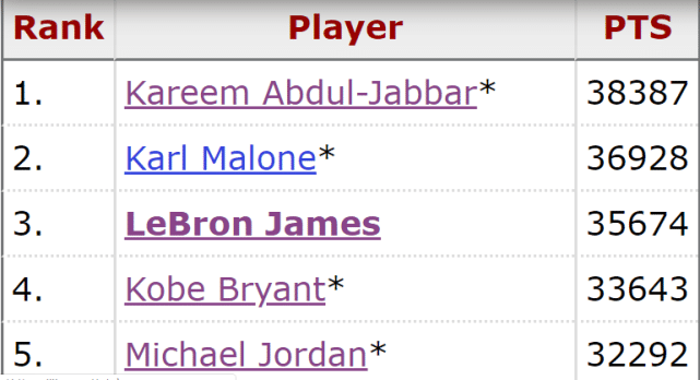 在超越贾巴尔之前,詹姆斯将先超越排名第二的卡尔-马龙。马龙目前的得分是36928分,詹姆斯还需要得到1255分可以超过他,同样以场均25.6分来计算,大概需要49场比赛。
