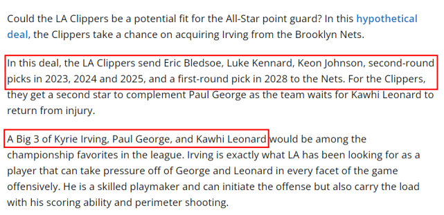 此前,美媒报道称篮网对交易欧文持开放态度,但外界普遍不看好他们能送走欧文。nbaanalysis建议的这笔交易具体方案是快船送出布莱德索、肯纳德、科恩-约翰逊、2023年、2024年、2025年的次轮签以及2028年的首轮签,从篮网换来欧文。等到小卡复出后,他和欧文、乔治可以组成快船版的三巨头,竞争总冠军。
