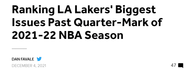 JRS直播12月05日讯 12胜12负,不敌快船后,湖人的胜率再次回到50%。赛季已经过去四分之一,这支球队的表现令人失望。北京时间12月5日,知名美媒Bleacher Report列出了湖人目前面临的6大问题,让我们来倒序揭晓——