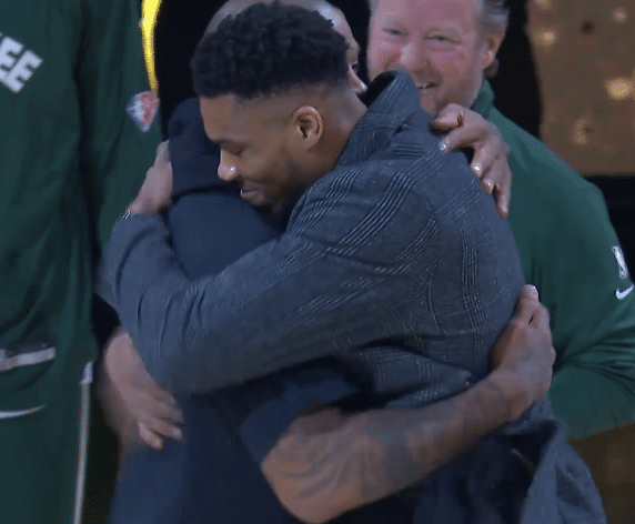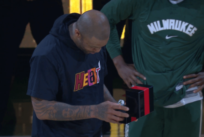 JRS直播12月05日讯 ,在热火和雄鹿赛前,PJ-塔克正式领取属于自己的总冠军戒指,字母哥紧紧拥抱前队友,塔克认真打量这一枚总冠军戒指,满脸洋溢着幸福的笑容,雄鹿主场还为塔克播放致敬视频。