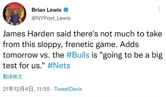 比赛结束之后,哈登接受采访的时候表示:“这场松松垮垮的、混乱的比赛没什么可学习的。他们疯狂的双人、三人包夹我们,比赛很丑陋,但我们还是赢下了比赛,明天对阵公牛对球队会是考验。”