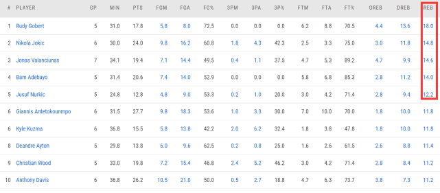 篮板榜中,排在第一的戈贝尔优势非常明显,场均18个可以说是独一档,第二名的约基奇只有14.8个,瓦兰丘纳斯14.6个排第三。值得一提的是,奇才前锋库兹马场均11.8个与字母哥并列第六,而库兹马生涯场均篮板只有5.6个,直接完成翻倍。