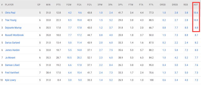 助攻榜中,太阳球星克里斯保罗场均10.6个排在榜首,特雷杨场均10个位列第二,马刺队德章泰穆雷8.8个排第三,湖人球星威少则以8.7个排第四,哈登场均8个第六。