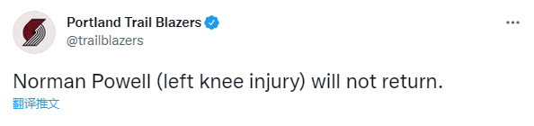 JRS直播10月24日讯,NBA常规赛继续,开拓者和太阳比赛中,开拓者首发锋线诺曼-鲍威尔受伤退赛,开拓者官方宣布鲍威尔左膝受伤,本场比赛不会回归。