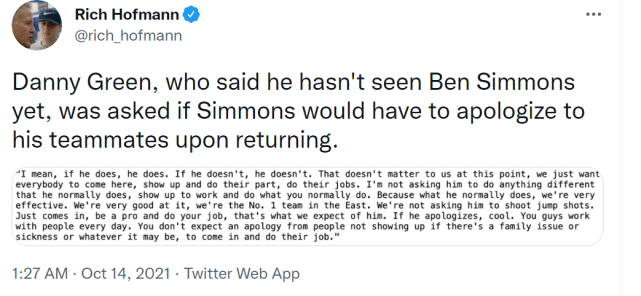 76人球员丹尼-格林接受了记者的采访,谈到西蒙斯归队后是否需要向球队道歉一事。“如果他道歉了,那就道歉了。如果没有,那就没有。现在道不道歉对我们不重要,我们只想要全员归队,做好各自的工作。”
