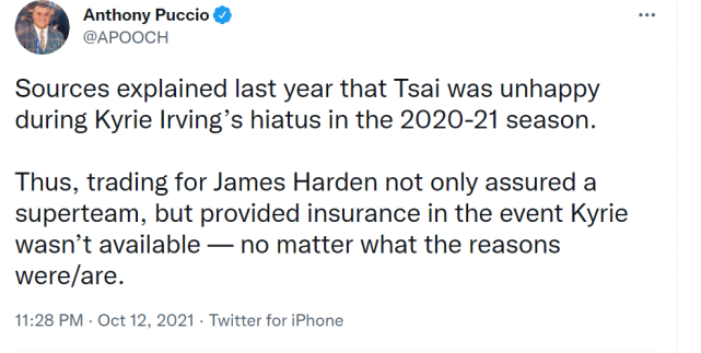JRS直播10月13日讯 ,篮网记者Anthony Puccio报道称,消息源透露,早在2020-21赛季,欧文因故缺席比赛时,篮网老板蔡崇信就已经不高兴了。他同意球队换来哈登,一方面是为了打造超级球队,另一方面就是为欧文准备一份保险,不管他未来因为什么原因缺席。