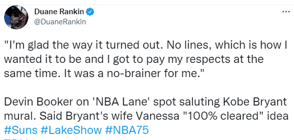 JRS直播10月10日讯 此前NBA官方发布了75周年纪念短片《NBA小巷》,其中有一幕是布克开车停到科比壁画前,然后向其表达敬意;对此布克透露他征求到了瓦妮莎的同意。