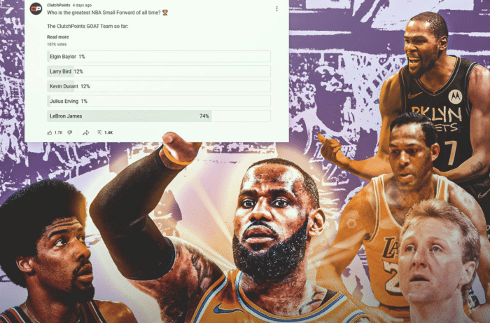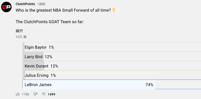 JRS直播9月20日讯 近日,知名体育媒体ClutchPoints在社媒上向球迷们发起了一项投票,询问谁是NBA历史上最伟大的小前锋。一共有5名候选人入围,分别是勒布朗詹姆斯、拉里伯德、凯文杜兰特、埃尔金贝勒以及朱利叶斯欧文。