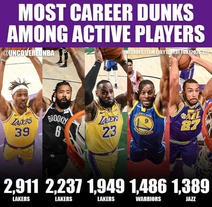 据美媒统计,NBA联盟现役扣篮排名前五的球员依次是霍华德(2911次)、小乔丹(2237次)、詹姆斯(1949次)、勇士伊戈达拉(1486次)和爵士戈贝尔(1389次);在这一份现役球员职业生涯扣篮总数榜单上,湖人包揽前三,詹姆斯、霍华德和小乔丹三人合计扣篮7097次。