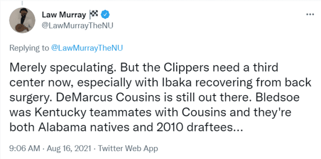 目前,这套阵容里缺少一个第三中锋,Murray报道称,快船休赛期的原计划是让阵容年轻化,更有运动能力,考辛斯并不是他们优先考虑的目标,但随着布莱德索的交易完成,情况可能发生一些变化。