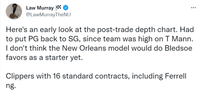 Murray指出,乔治在阵容中很可能继续打得分后卫,而不是因为小卡伤停而改打小前。原因是快船非常重视曼恩,新赛季,曼恩大概率取代小卡打首发小前。另外,Murray预测雷吉首发,布莱德索可能打替补。