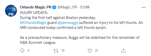JRS直播讯 北京时间8月14日,魔术5号秀核磁检查结果出炉,伤情确诊为左手拇指扭伤,出于谨慎考虑,19岁的杰伦-萨格斯将缺席 NBA夏季联赛的剩余比赛;魔术队已经官宣萨格斯的伤情报告。