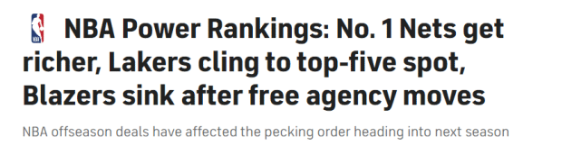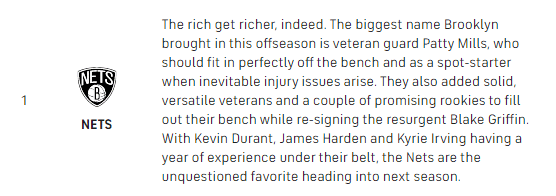 篮网高居实力榜第一。CBS体育认为,富者更富,篮网在休赛期签下的帕蒂-米尔斯,完美匹配他们的阵容。他们还续约了格里芬。在杜兰特、哈登和欧文的率领下,这支球队依然是下个赛季的夺冠大热门。