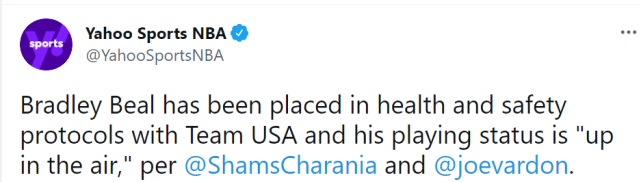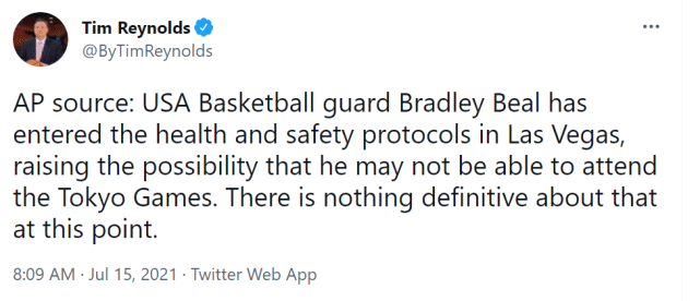 JRS直播讯 北京时间7月15日,据名记查拉尼亚报道,布拉德利-比尔因触发健康安全协议被隔离,何时回归还是未知数。另一位名记雷诺兹证实了查拉尼亚的报道,并透露比尔有可能因此缺席东京奥运会。