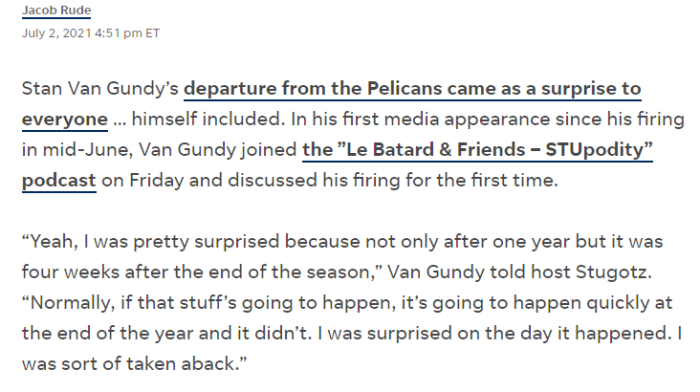 JRS直播讯 大范甘迪执教鹈鹕一个赛季就被炒鱿鱼,对于大范来说确实是一个羞愧难当之事,去年还被鹈鹕高级别接待,一个赛季之后鹈鹕没有打出优秀战绩,就这样被炒鱿鱼,鹈鹕还说是共同决定,但大范或许不满被鹈鹕炒鱿鱼,他应该还是渴望继续留队执教,所以在《STUpodity》节目上谈到自己被炒鱿鱼的原因,大范表示并非共同决定,关键原因是他与鹈鹕总裁格里芬出现巨大分歧,导致了大范被迫离开鹈鹕。