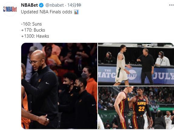 从美媒晒出的赔率来看,太阳夺冠赔率-160,雄鹿+170,老鹰则是+1300!目前太阳最大的优势就是健康,他的核心球员和轮转球员都是健康的,而另外两队字母哥和特雷杨何时能复出现在还没有确定的消息,假设两人要缺席一部分的比赛,那么太阳胜算肯定更高一些!
