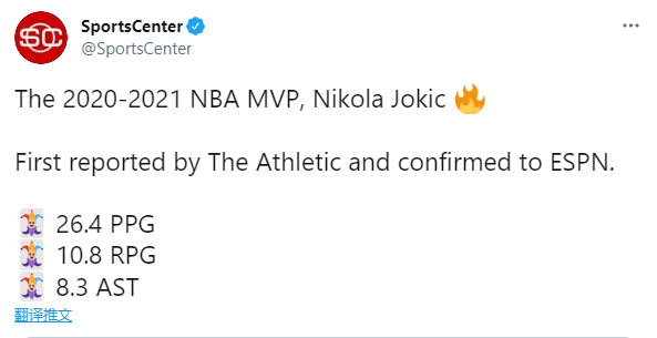 美媒Sports Center恭喜约基奇夺得MVP,连用三个小丑的表情,晒出约基奇数据——场均26.4分10.8篮板8.3助攻。