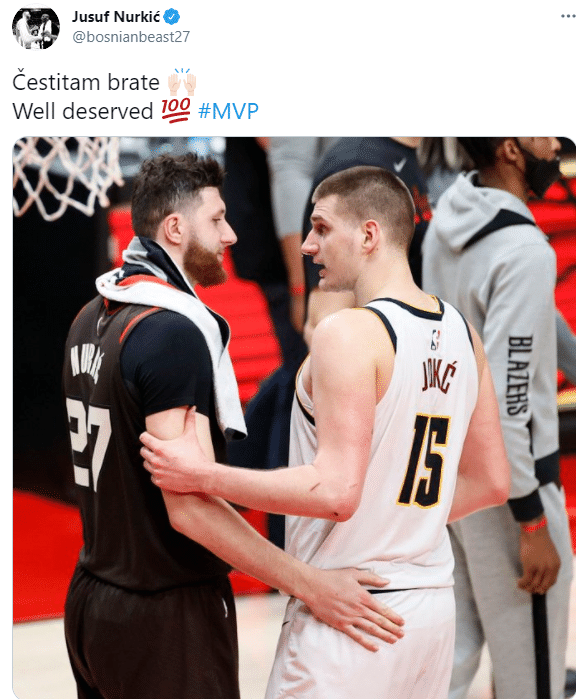 约基奇前队友努尔基奇第一时间恭喜约基奇,开拓者球员晒两人同框合影,发推写道:恭喜你,兄弟!实至名归#MVP