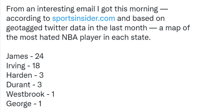 排名第二的是欧文。过去一个赛季,欧文因多次请事假,以及一些场外事件和言论频频引起热议。篮网的另外两位巨头也上榜了,但招黑能力还是比欧文差多了。哈登和杜兰特并列排名第三,各有3个州最不喜欢他们。