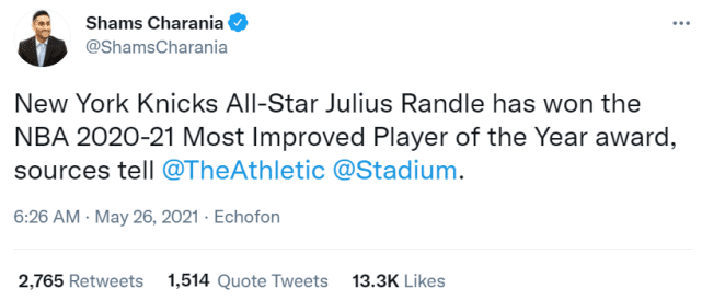 JRS直播讯北京时间5月26日,据名记查拉尼亚报道,尼克斯球星朱利叶斯-兰德尔当选2020-21赛季的年度进步最快球员。本赛季常规赛,兰德尔打了71场比赛,场均贡献24.1分10.2篮板6助攻,他在4月份当选过一次周最佳球员,还是东部4月份的月最佳球员。