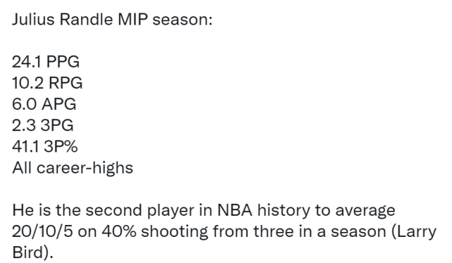 和上赛季相比,兰德尔确实取得了明显的进步。2019-20赛季,兰德尔场均贡献19.5分9.7篮板3.1助攻。本赛季,兰德尔的三项数据都有提升,特别是三分命中率方面,看得出来兰德尔在休赛期下了苦功。他本赛季的三分命中率是41.1%,而上赛季只有27.7%。2020-21赛季,兰德尔也生涯第一次入选全明星。