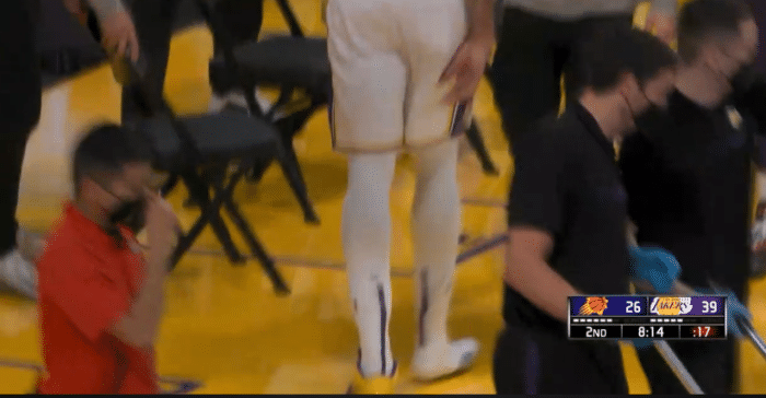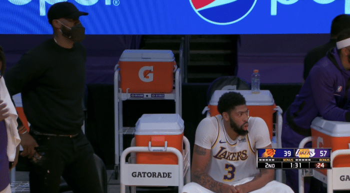 JRS直播讯 北京时间5月10日,湖人和太阳比赛中,詹姆斯坐在场边为队友鼓劲,浓眉延续火热手感,半场15投8中拿到22分5篮板1盖帽1助攻,在场正负值+17,浓眉把鞋都拼掉了;詹姆斯关心浓眉,多次走到浓眉面前和他互动,期待湖人双巨再次合体。