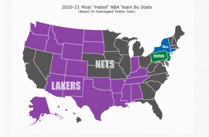 JRS直播讯有人爱就有人恨,爱你的人越多,恨你的人为你也就越来越多。这对于NBA球队也是一样的道理,现在球迷们最喜爱的球队,也是黑子最多的球队。由于历史原因和其他原因,联盟始终有那么几支全民公敌的存在,毕竟潜在的对手也算是自己的敌人。现在的NBA,称得上全民公敌的球队有不少,最近有美国媒体进行了一次网络投票,各州进行投票,选出自己的讨厌的NBA球队,而结果非常令人意外,统治联盟的湖人竟然没排在第一位,一起来看一下结果吧!