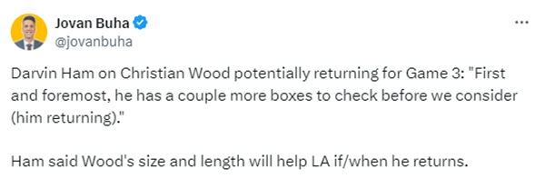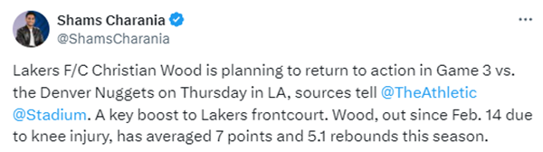 JRS直播讯 北京时间4月22日,据名记shams报道,湖人内线克里斯蒂安-伍德计划在与掘金系列赛的G3复出,他的回归是对湖人前场的一大关键补充。