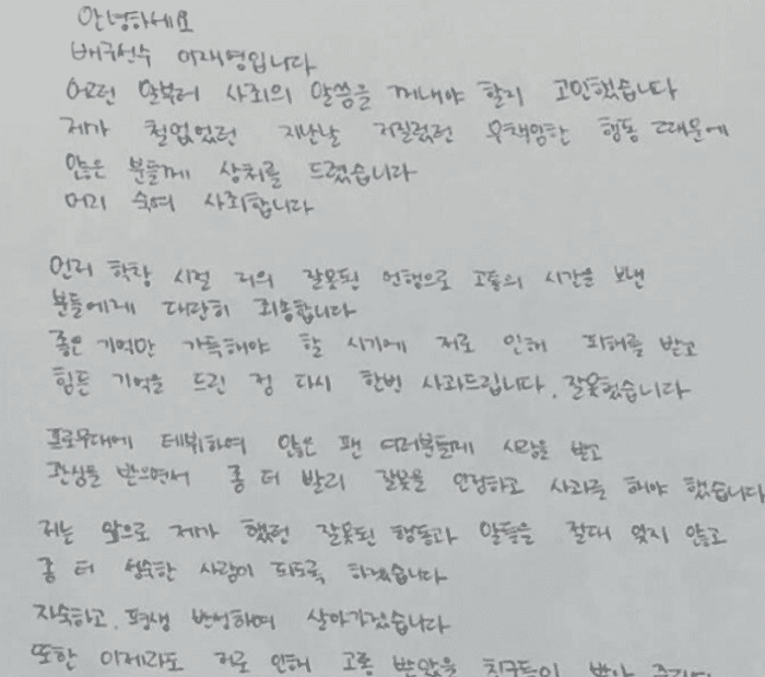 同时李多英还表示自己当初写下的道歉信也不是本意,当时的情况是俱乐部连给他们想的时间都没有,直接扔过来让她们照抄,有些事她们没做过,但是也被写在了道歉信的里面。