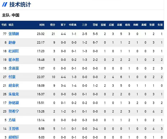 根据数据显示,张镇麟轰下21分,他的篮下、中距离和罚球都是百发百中,只有三分球5中2。付豪是第二位得分上双的中国队球员,拿下10分。赵睿和胡金秋都是9分,王哲林5分,但他登场的时间只有不到7分钟。