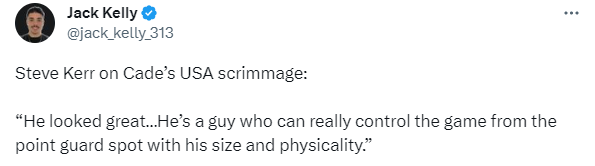 名记Joe Vardon表示坎宁安在陪练队中模仿东契奇,带队击败美国男篮,对于活塞来说,这是一个好消息,对于美国男篮来说,输给陪练队算是一种成人礼。
