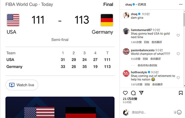 湖人另一名宿奥尼尔则转发美国男篮输球的最终赛果,并写道:惊呆了。