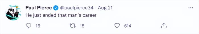 在霍姆格伦受伤的第一时间,詹姆斯对此事表示抱歉,霍姆格伦也没说什么,但是作为联盟正义使者的皮尔斯却坐不住了。他在自己的社交媒体中写到:“He just ended that man’s career.”意思是,他刚刚毁掉了一个人的职业生涯。皮尔斯虽然没有点名道姓地骂,但明眼人都知道,皮尔斯说的“他”和“一个人”指的是谁和谁。皮尔斯这人确实有点意思,联盟里那么多球星,他偏偏和詹姆斯过不去,说他是詹黑头子也不为过。詹姆斯没有理会皮尔斯,如果换成是杜兰特的话,高低要回皮尔斯一句,“He just ended that man’s retirement ceremony”。(他毁了那个人的退役仪式)
