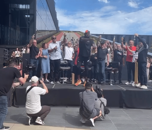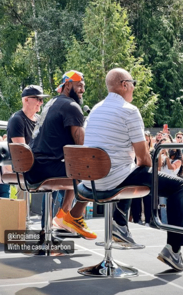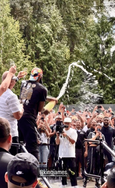 37岁的詹姆斯身穿黑色T恤、反戴棒球帽亮相,现场聚集了很多耐克员工,他们排队夹道欢迎老詹;詹姆斯高呼之后登台,先是尽情泼洒香槟并且猛喝一大口,之后拿剪刀剪彩,并与众人击掌庆祝,这意味着勒布朗-詹姆斯创新中心正式揭幕。