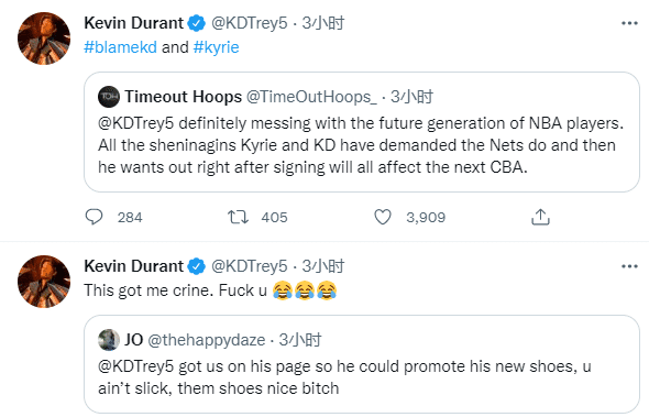 一位球迷发推写道:杜兰特让我们上他的主页,这样他就可以宣传他的新鞋了,你的鞋很不错,Bxxch;杜兰特回应:这让我(感动)哭了,法克油。