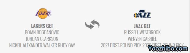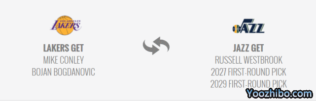 第一笔交易方案是湖人送出威少、2027年首轮和2029年首轮,得到爵士的老将迈克-康利和博扬-博格达诺维奇。这笔交易的核心是博扬,他是湖人需要的射手,可以成为场上的第三进攻点,分担詹姆斯和浓眉的进攻压力。