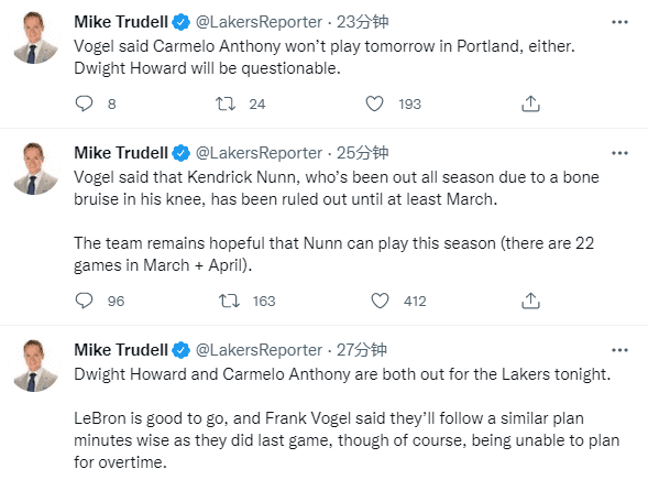 JRS直播02月09日讯 ,湖人主场对阵雄鹿赛前,沃格尔透露安东尼(右腿筋拉伤)和霍华德(下背部紧张)因伤缺席本场比赛,詹姆斯会继续出战;沃帅还透露纳恩因伤继续休战,3月份之前不会复出,而且没有具体的复出时间表。