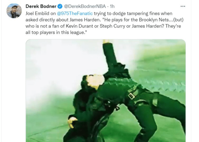 有记者提到哈登和76人之间的交易流言时,恩比德说:“他效力于布鲁克林篮网……(但)谁不是杜兰特、库里或者哈登的球迷呢?他们都是这个联盟里顶尖的球员。”76人记者Derek Bodner晒出了黑客帝国里的一张动图,调侃恩比德在躲避违规引诱的罚款。