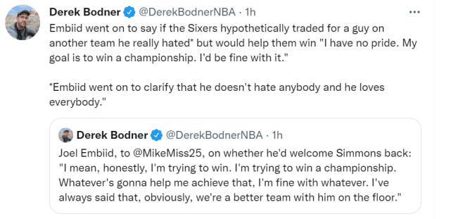 随后有记者问到西蒙斯的问题,当时在败给老鹰后如何行动,可以避免西蒙斯状况的发生?恩比德的回应是:“我能唯一想到的就是言论。但回过头看看,我们一整年说了些什么。教练一直在支持我们,特别是西蒙斯,一整年都是如此,总是在赞美。所以如果只是那一次评价导致目前的状况,那是不公平的。因为每个人都被允许犯错,特别是在那样的时刻。但我真的相信问题不是那样。当然,不同的人面对压力的反应不同。”