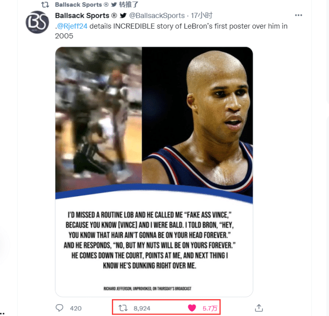值得一提的是,杰弗森这段回忆也在推特上引来了热议,超过5.7人万进行了点赞。