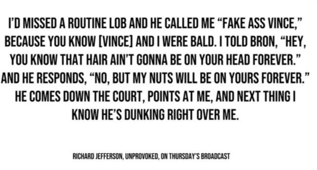 大家都知道我和卡特都是秃头,杰弗森立马回应詹姆斯:嘿,你知道你的头发也不会永远留在头顶的。而詹姆斯再次重击杰弗森:没错,但我的蛋蛋会永远在你头顶。
