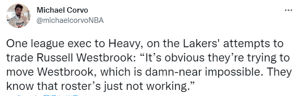 据美记者Michael Corvo报道,NBA匿名高管表示:很明显,他们正试图交易威斯布鲁克,他们知道威少在湖人阵容中不奏效,但这几乎是不可能发生的。