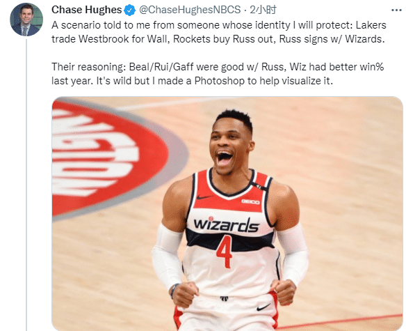 奇才记者Chase Hughes报道,一位匿名人士告诉我一种交易方案——湖人交易威少换来沃尔,然后火箭买断威少,威少重回奇才;理由是威少和八村塁的组合很好,上赛季奇才的胜率更高,这太疯狂了。